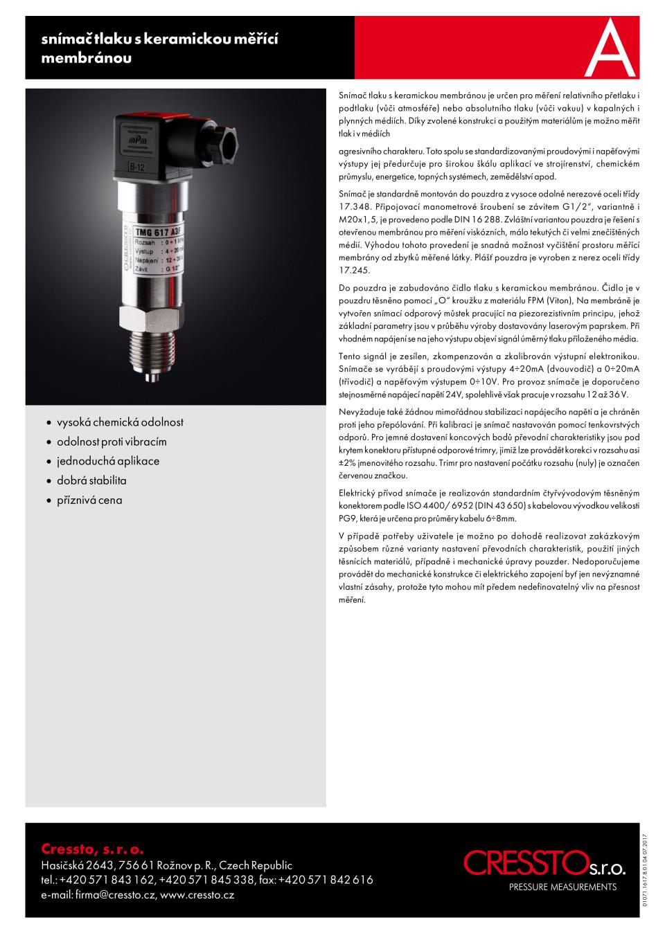 Le champ de base dans laquelle l'entreprise CRESSTO Ltd travaille depuis 1992, est une pression électronique mesure. Le programme principal est le développement, la production, l'application et la vente de capteurs, transducteurs, jauges et mesure de la pression périphérique, et sont utilisés avec succÚs la technologie spéciale comme anodique du silicium soudure, découpage au laser de minces couches résistives, surface technologie de montage, la création de haute pression scellé ,. Tous avec le soutien des méthodes et procédures de mesure et de contrÎle modernes qui garantissent un niveau stable de trÚs bons produits et services de qualité.