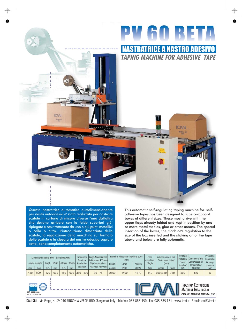 ICMI immédiatement se consacre à la conception et la fabrication de machines pour la fermeture et coller des boîtes en carton avec des rubans sur papier gommé (cachet de sécurité, écologique, économique et durable) ou des autocollants. Aujourd'hui, grâce à l'expérience est en mesure d'apporter des solutions aux problèmes des clients d'emballage, offrant machines standards flexibles et fiables, mais aussi la conception et la construction de machines de «mesurer», que de nombreux et importants clients prouvent. Pour les petites ou grandes boîtes élevés ou faibles potentiels, qui doivent être enregistrées / agrafées, collage, multiple offre spéciale toujours les solutions techniques les plus appropriées, avec l'objectif d'une réduction substantielle du coût de l'emballage, l'amélioration de l'image de la clientèle et l'intégrité de son produit.