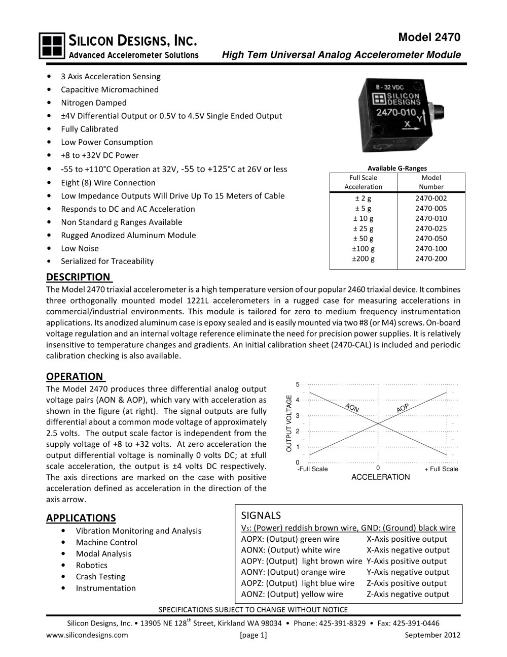 Silicon Designs, situé juste à l'extérieur de Seattle, Washington, est spécialisée dans la conception et la fabrication d'accéléromètres MEMS capacitifs de qualité industrielle extrêmement précis et robuste avec amplification intégrée. Les capteurs sont proposés en huit gammes standard de 2 g à 400 g avec un large éventail de sensibilités à grande échelle.