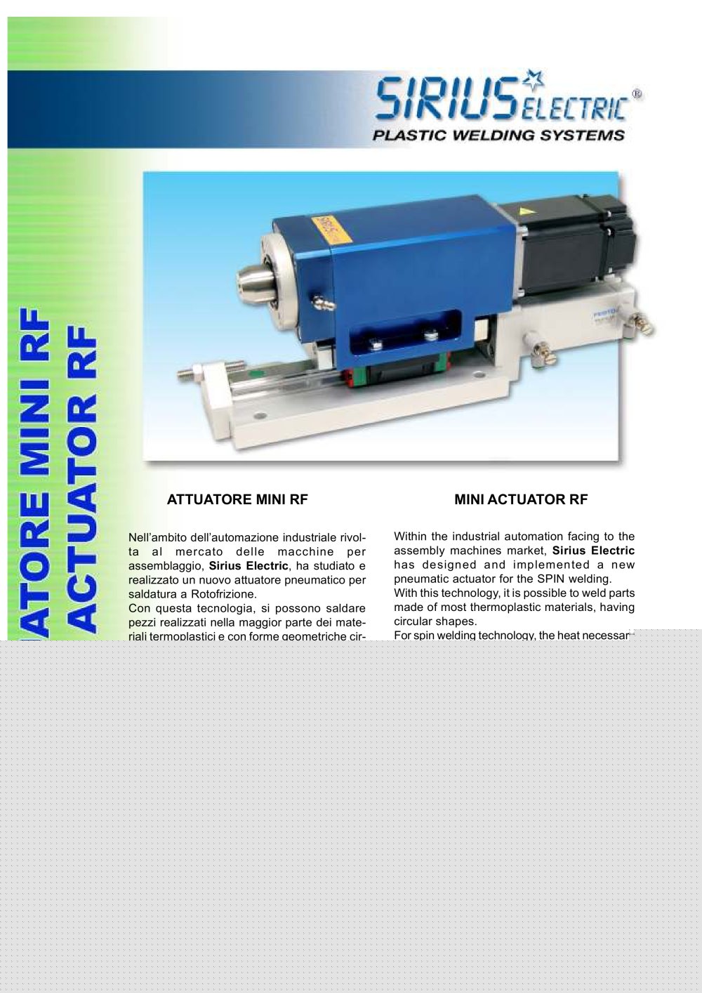 Sirius électrique est une société italienne basée à Vigevano (PV) présents sur le marché pour la soudure des plastiques ayant de l'expérience acquise en plus de 20 ans. produire et vendre dessoudeurs ultrasons, soudeurs plaque chauffante, soudeuses par vibrations et le soudage tourner soudage. Les différentes technologies utilisées dans le domaine de la soudure nous permettent d'être en mesure de résoudre de nombreux problèmes d'assemblage de pièces en matériau thermoplastique.