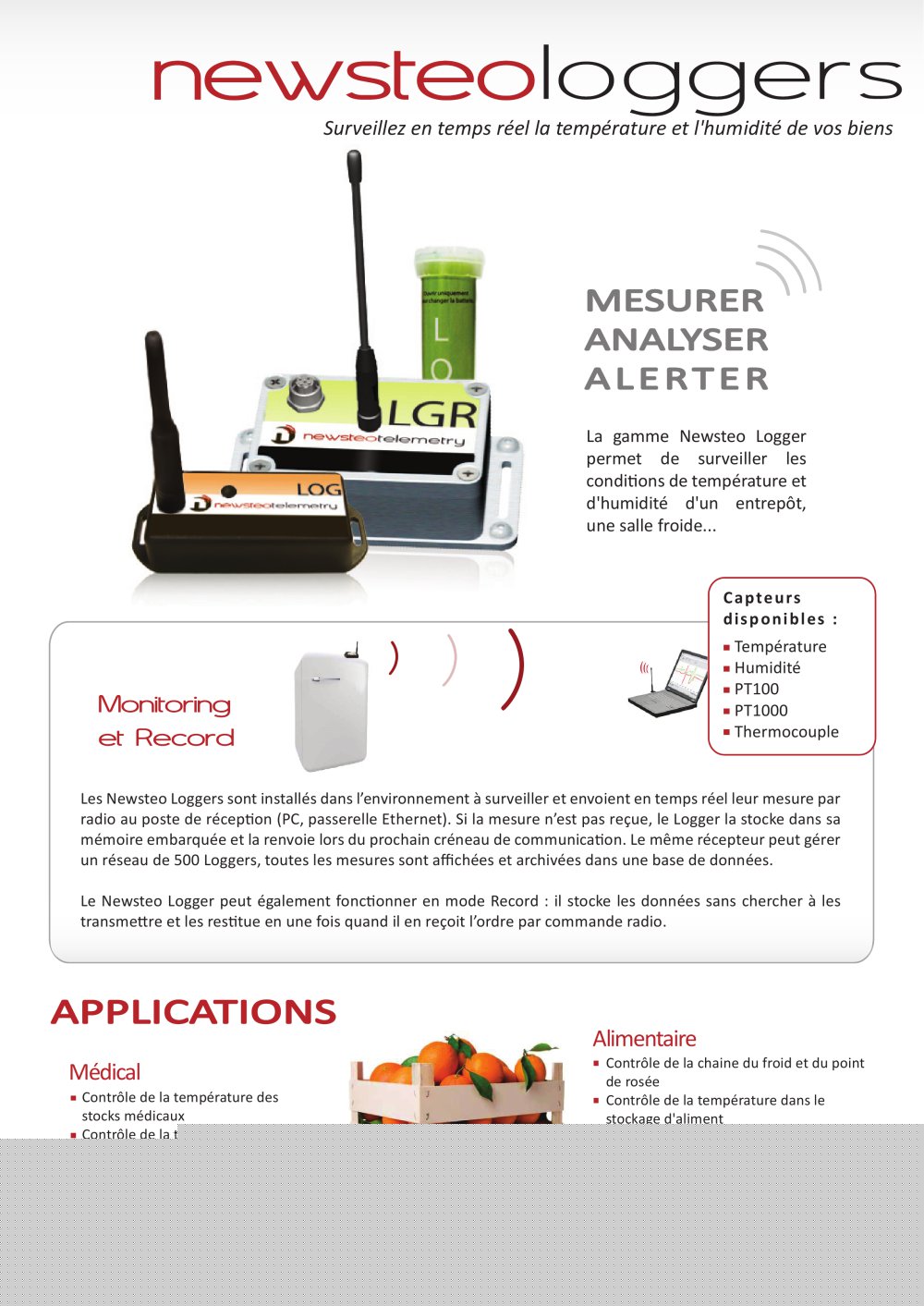 Newsteo propose une solution complète de transfert et de gestion de données sans fil à des fins de traçabilité, d'identification et de supervision. La gamme de produits 'clé en main' de Newsteo permet, par exemple, la surveillance de la température, de l'humidité, de chocs... dans différents milieux / environnements à risque (surveillance de denrées alimentaires, de produits pharmaceutiques...).